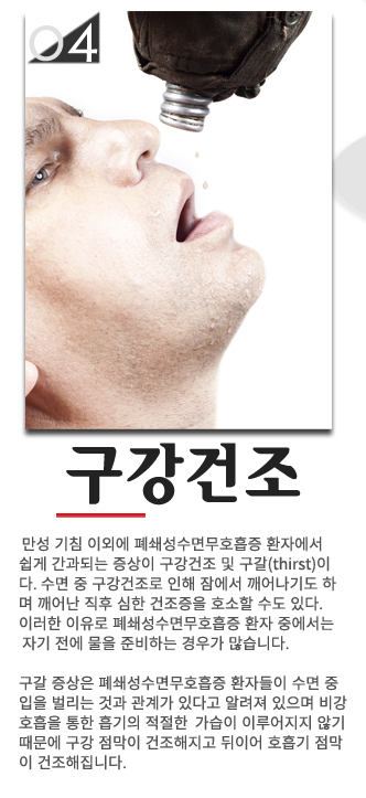 수면 중 구강건조는 폐쇄성수면무호흡증의 전형적인 증상은 아니지만 많은 환자들이 이에 대한 불편감을 호소하는 만큼 충분한 설명이 필요하며, 특별한 기저 질환 없이 수면과 관련된 구강건조를 보이는 경우 폐쇄성수면무호흡증에 대한 의심을 해봐야 합니다.